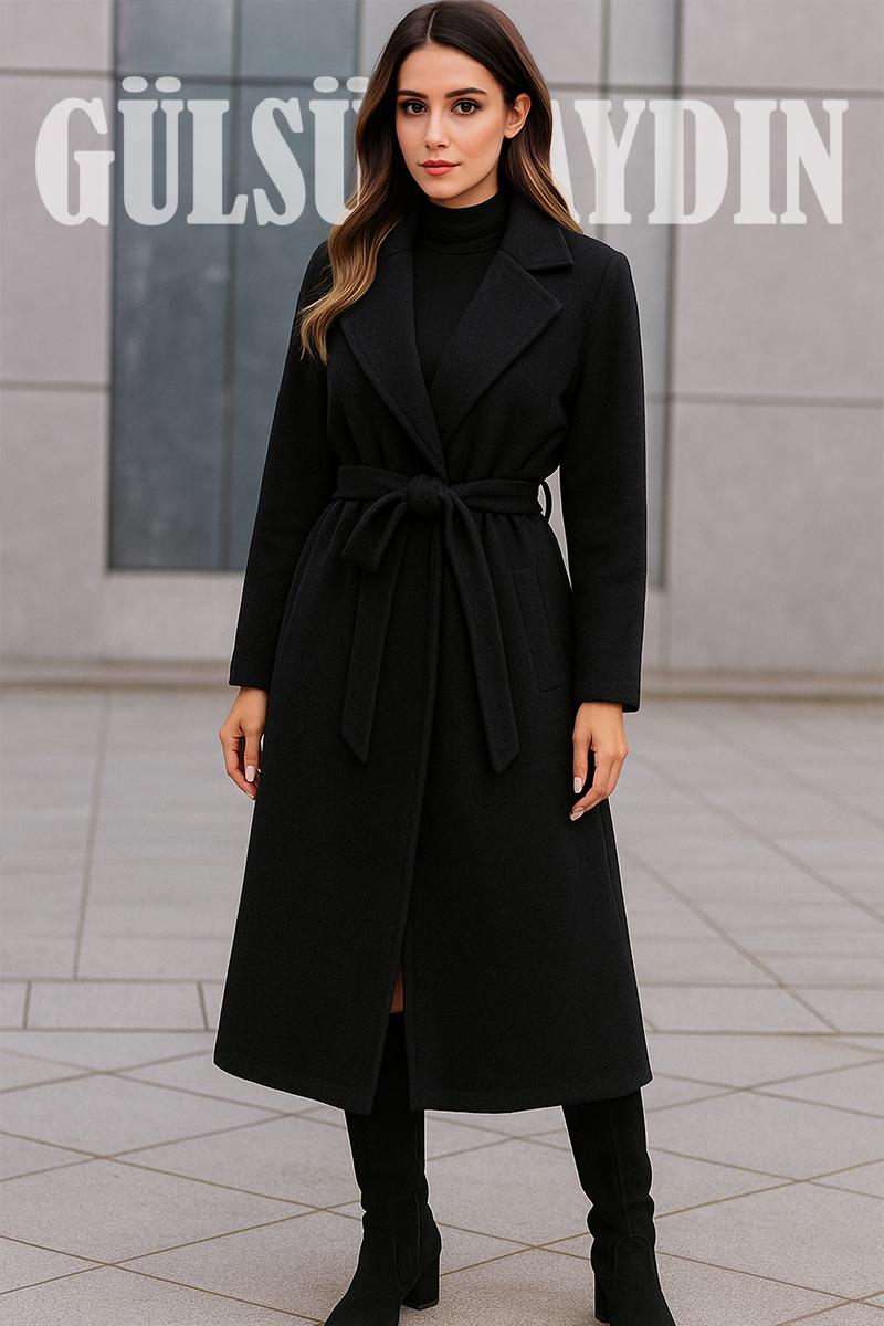Belden Kuşaklı Siyah Kaşe Kaban – Şık ve Modern Kadın Kaban Modeli